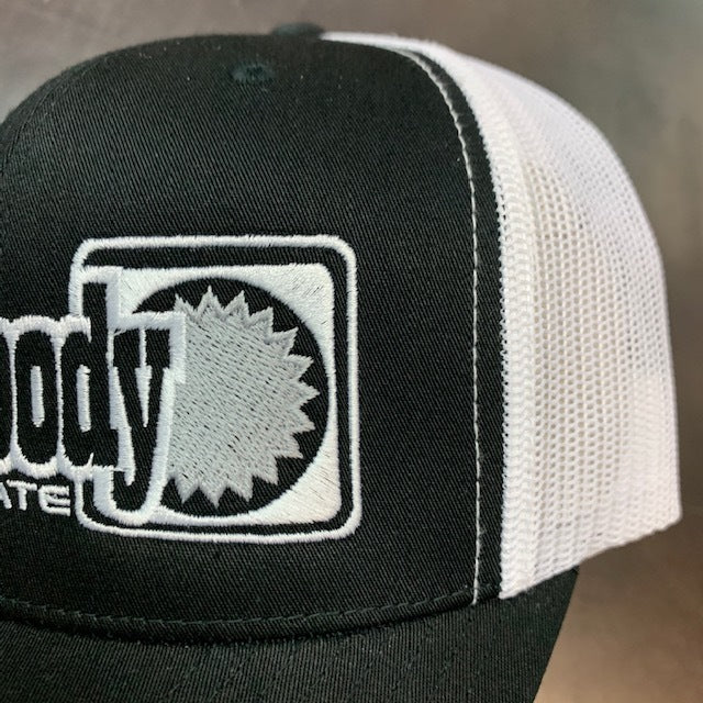 CURVED BLACK AND WHITE WITH SILVER STAR SNAPBACK RETRO TRUCKER MESH WITH SBS LOGO #4 HAT
