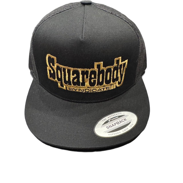 14k from Squarebody Syndicate is the perfect accessory for any event. This classic black flatbill snapback retro mesh trucker hat is sure to turn heads with its black and Gold Squarebody Syndicate logo on the front. Offering a snug yet comfortable fit with one-size-fits-most.